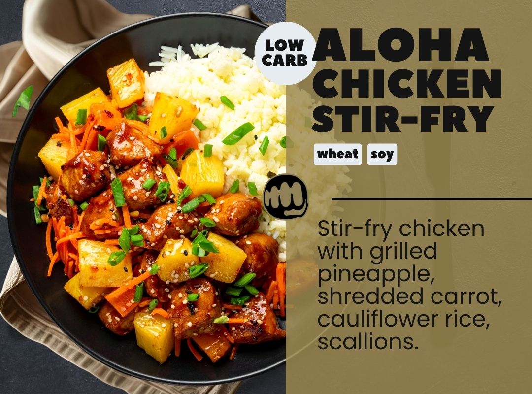 Stir-fry chicken with grilled pineapple, shredded carrot, cauliflower rice, scallions.