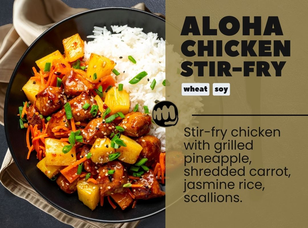 Stir-fry chicken with grilled pineapple, shredded carrot, jasmine rice, scallions.