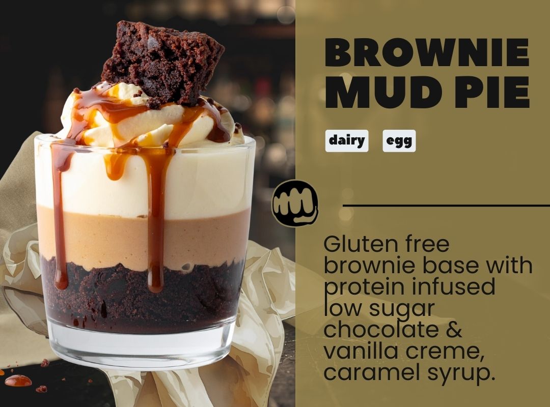 Gluten free brownie base with protein infused low sugar chocolate & vanilla creme, caramel syrup.