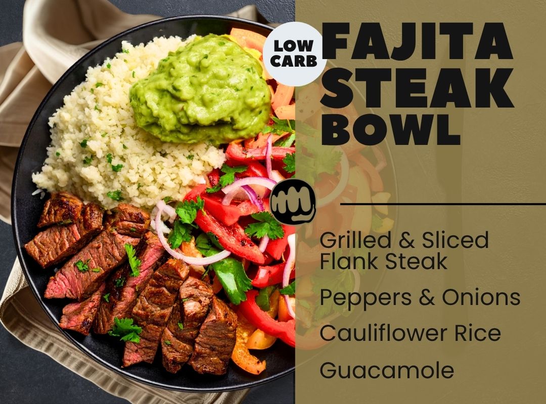 Marinated & sliced grilled flank steak, charred bell peppers & onions, cilantro lime cauliflower rice, guacamole.
