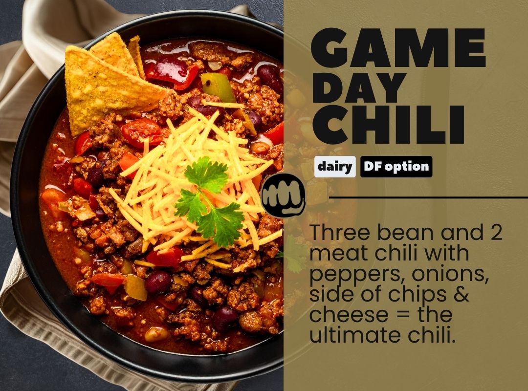 Three bean and 2 meat chili with peppers, onions, side of chips & cheese = the ultimate chili. (dairy free option)