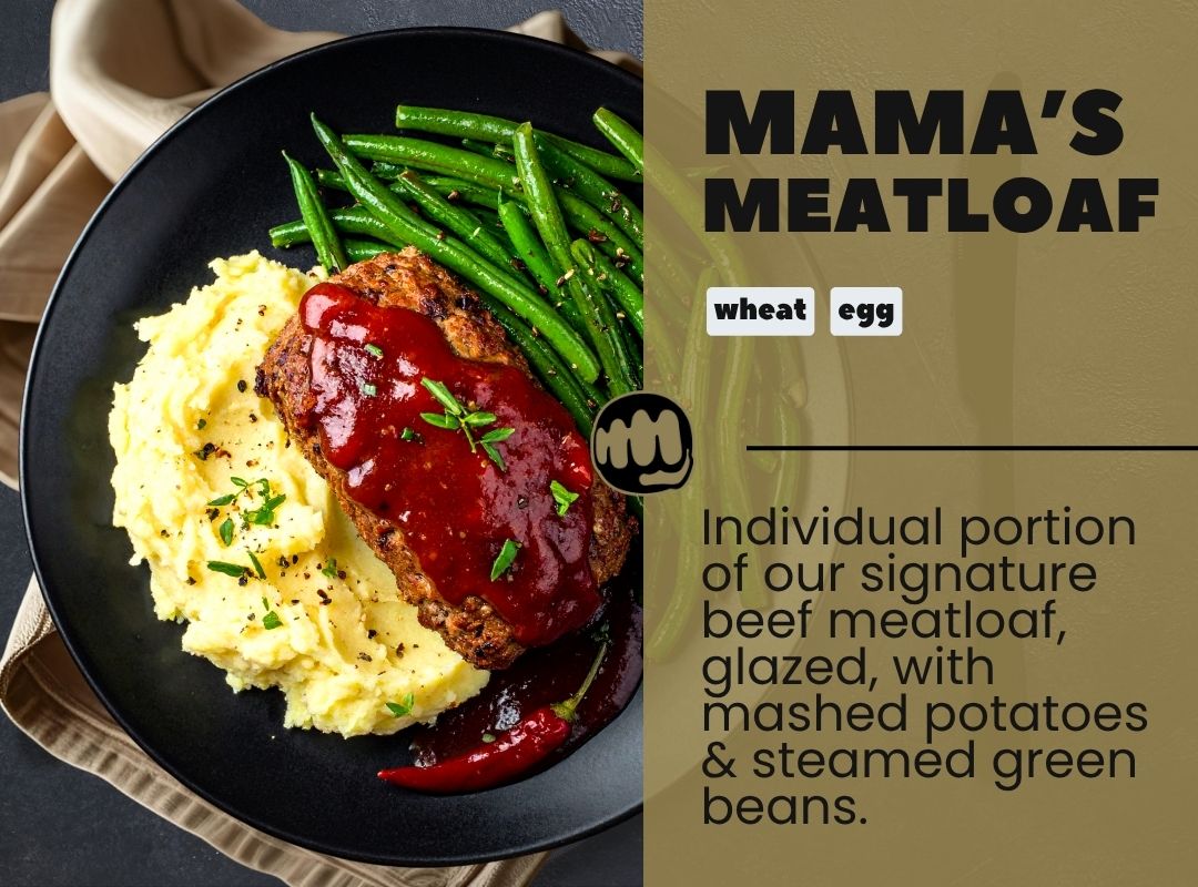 Individual mini Angus beef meatloaf, glazed, with fresh oil & vinegar green beans, olive oil mashed potatoes.