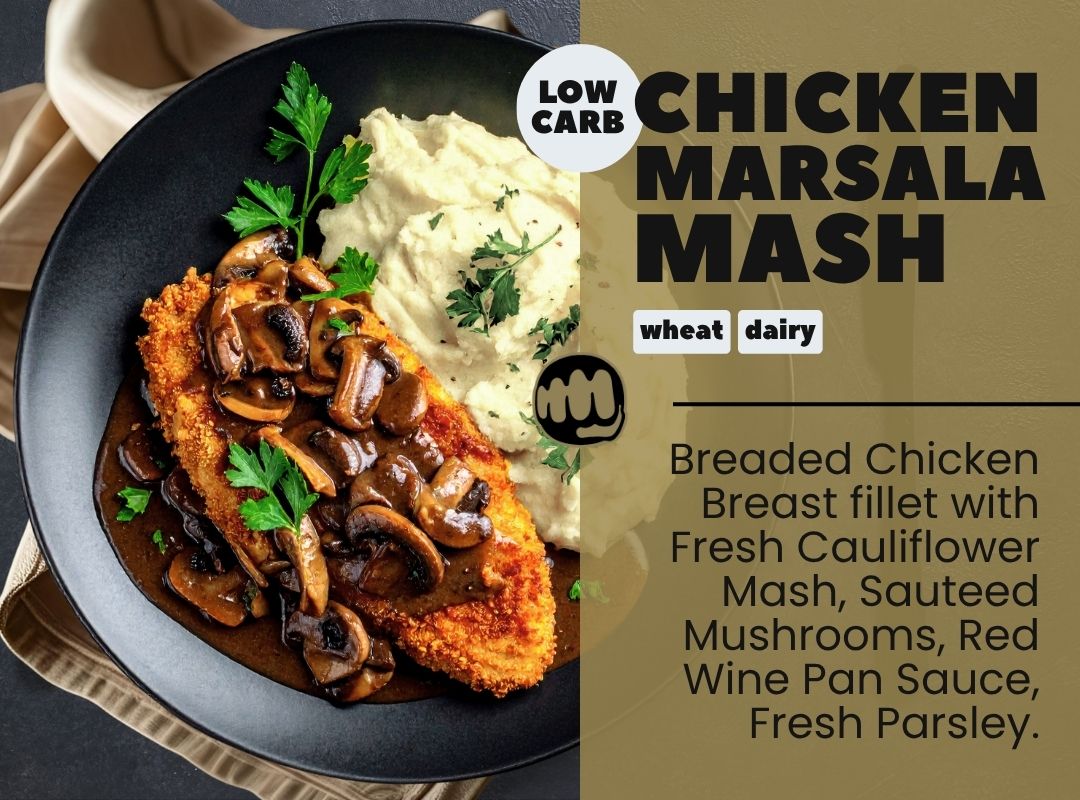 Baked breaded chicken, cauliflower mash, caramelized onion, mushrooms, red wine broth, parsley.