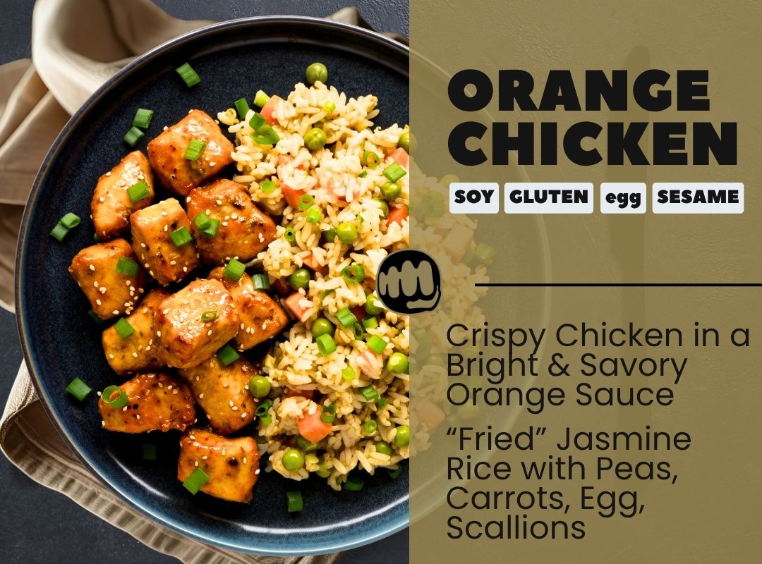 Crispy chicken bites, tossed in a sweet and tangy Orange sauce, served with egg fried jasmine rice, carrots, peas & scallions.