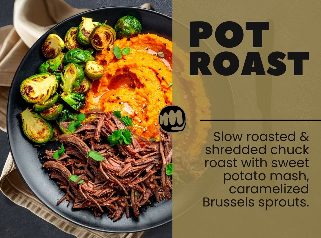 6 hour slow cooked, lean chuck roast is pulled and served with sweet potato mash & caramelized brussels.