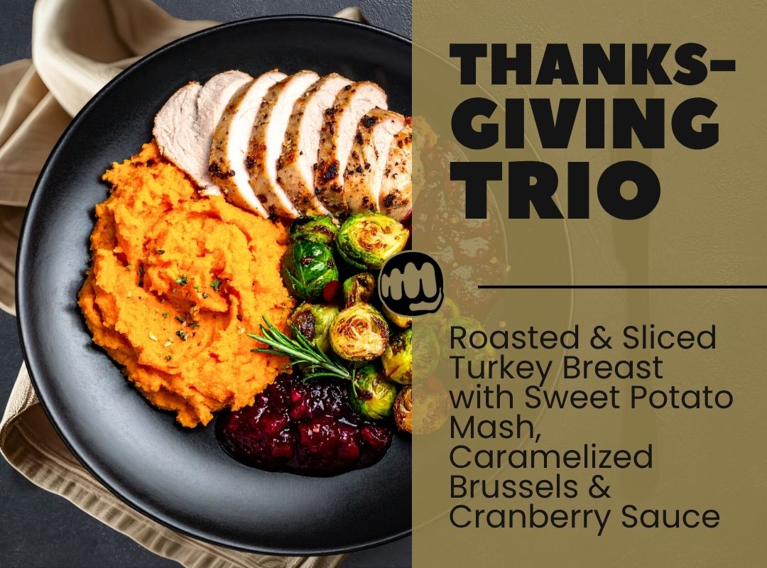 Roasted & Sliced Turkey Breast with Sweet Potato Mash, Caramelized Brussels & Cranberry Sauce.
