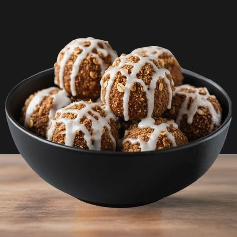 Gluten free protein-infused coffee cake bites, rolled in low-sugar vanilla glaze and walnut-oat streusel. 10 bites / order. 2 balls/serving.